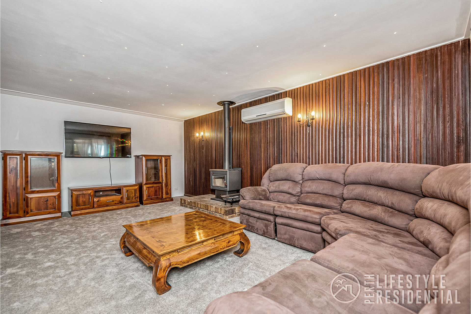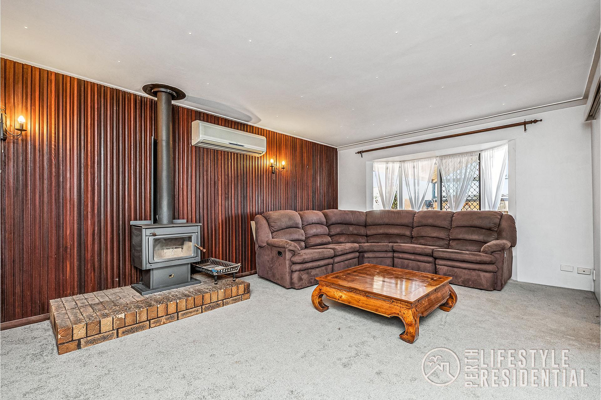 Big front lounge with split aircon and wood fire.